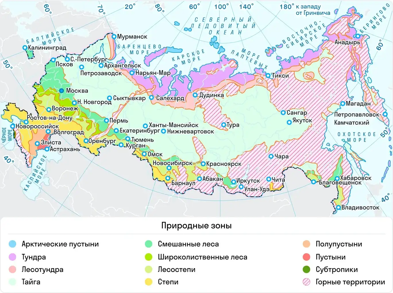 | Арктическая | Тундра, полярные пустоши | Экстремально низкие температуры, небольшие осадки |