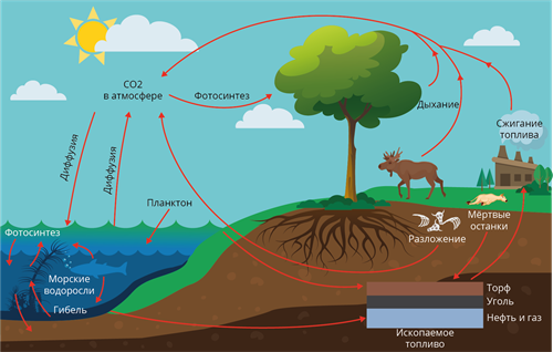 | Биосфера (растения, животные) | Фиксация и дыхание, разложение | Малые по сравнению с другими резервуарами |